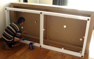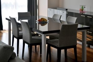 Mobilyalar tekrar eden modüllerden kurgulandığı için kutular olarak üretildi, hangi ürüne dönüştürülecekse ona göre montajı yapıldı. Beyaz metal kaide üzerine standardize edilmiş ölçüler ve tekrarlayan katlarından gri ve parlak ahşaplar ile tv ünitesi, dresuvar, orta sehpa, misafir gardrobu, komodin, yemek masası, ofis masası, ayakkabılık, çocuk oyuncak kutuları üretildi. Beyaz ve gri parlak renk tercihi mekan karakterinin tamamlayıcısı konumunda olup, bunlar ince, narin ve mobilyaya uyumlu metal kulplar ile tamamlandı. Amaçlanan modern, şık ve minimal atmosfer bu şekilde oluşturuldu.